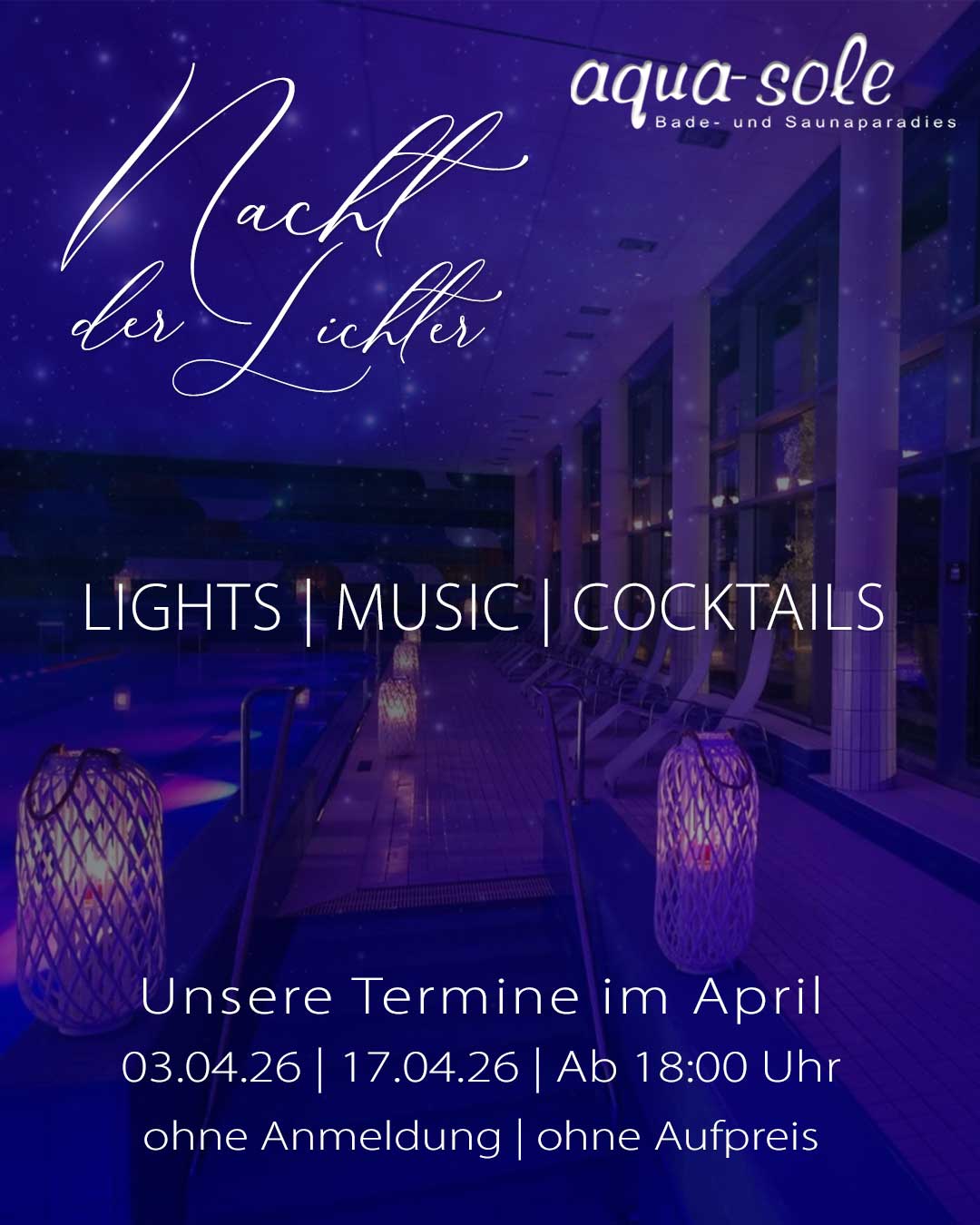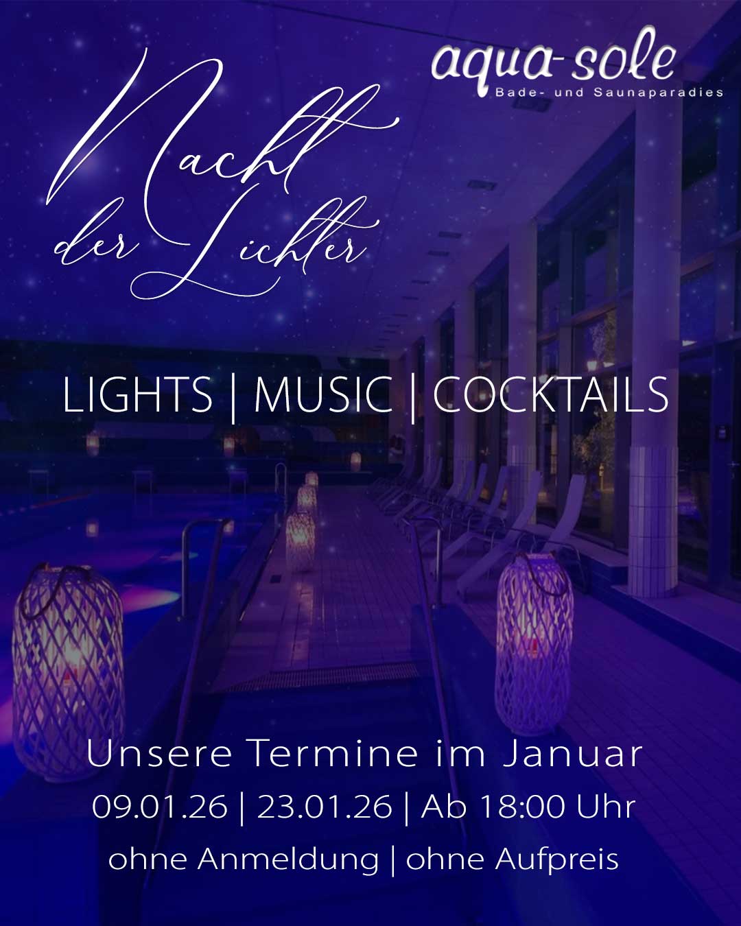 Lassen Sie sich überraschen und in wechselnde Welten entführen. An unseren besonderen Lichterabenden illuminiert Kerzenlicht das aqua-sole und schafft eine einzigartige Wohlfühlatmosphäre.